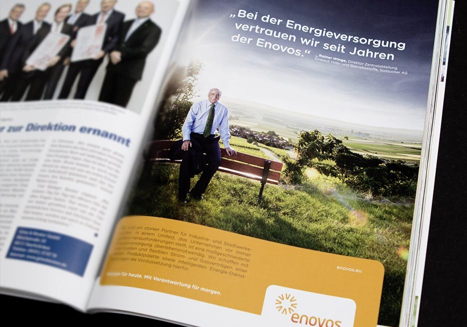 Zusammen mit unserer Schwester HDW Werbeagentur und dem Berliner Star-Fotografen Oliver Mark haben wir die neue Anzeigenkampagne der Enovos Deutschland SE umgesetzt. Wir waren hierbei für die Post-Produktion verantwortlich. Ziel war es, einen gemeinsamen Look für beide Motive zu entwickeln, sowie die Bilder entsprechend der Format-Anforderungen zu erweitern.