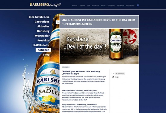 Die Website der Karlsberg GmbH bietet neben der reinen Produktinszenierung durch 3D-Renderings einen ausführlichen Event-Kalender, einen Online-Shop, Wetterinfos, den sogenannten KARLkulator, tolle Gastronomie-Tipps und ein ausführliches Newscenter rund ums Bier-Gefühl in unserer Region.